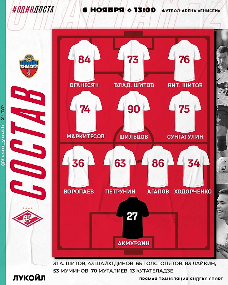 Состав. Впервые за 11 месяцев в составе «Спартака-2» сыграл правый защитник Никита Ходорченко, восстановление которого от травмы ахилла заняло почти год. В состав вернулся капитан команды Фаниль Сунгатулин, отбывший дисквалификацию.