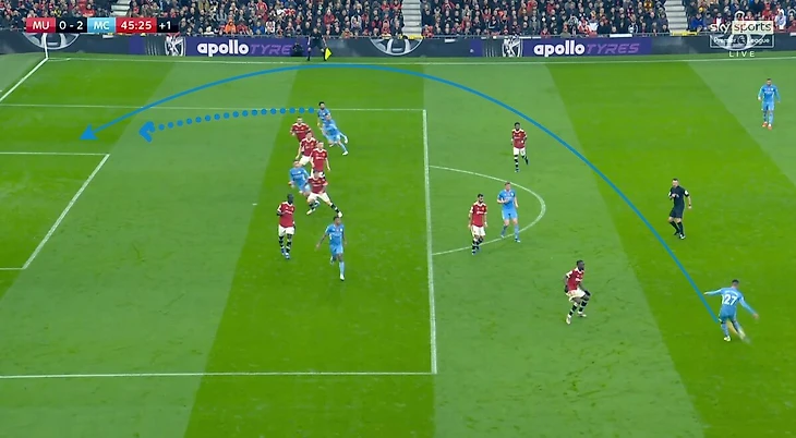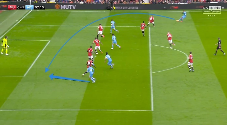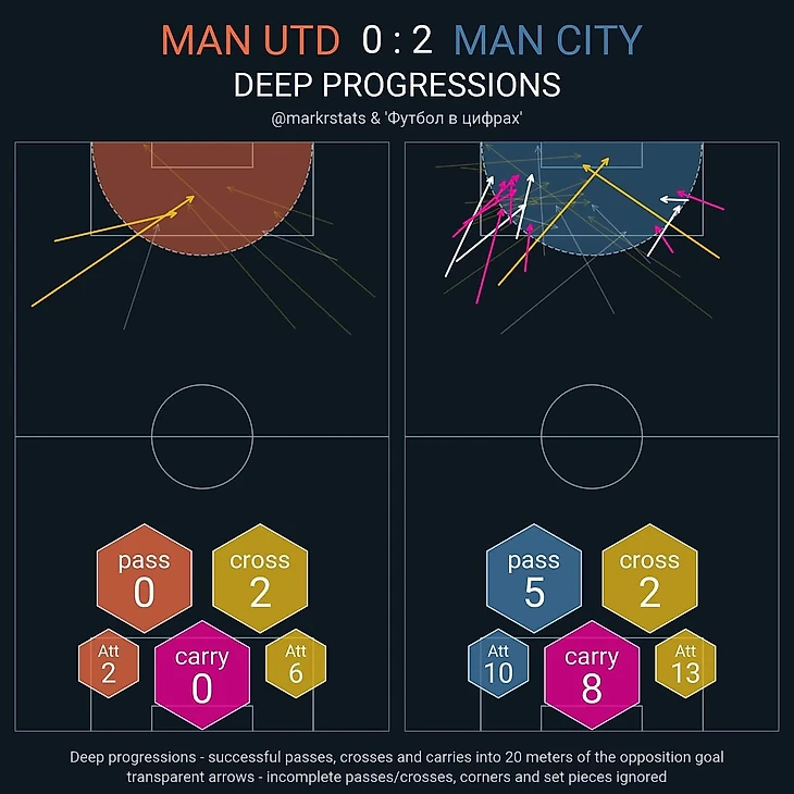 Потери в составе у хозяев были серьезнее, чем у команды Пепа: Варан, Кавани, Погба не могли сыграть из-за травм и дисквалификации, тогда как у гостей отсутствовали Торрес и Лапорт. Несмотря на отсутствие ключевого центрбека, Сульшер не отказался от схемы с пятью защитниками, выпустив Байи в задней тройке. У Гвардиолы же впервые в этом сезоне АПЛ вышла связка Диаш - Стоунз. Отметим также появление у "МЮ" Гринвуда в паре с Роналду в нападении. Молодой форвард стартовал с трех голов в трех турах чемпионата, но затем смог отличиться лишь раз в следующих шести матчах. Без мяча Мэйсон располагался глубже Криштиану, перекрывая направление передач на Родри, ввиду чего "МЮ" действовал в структуре 5-2-2-1 или 5-3-1-1, если Бруно уходил в линию к Фреду и Мактоминею. Впрочем, как такового давления не было: показатель PPDA в радиусе 35 метров от центра ворот Эдерсона превышал 55. В свою очередь "Сити" не отказывался от высокого прессинга, нередко возвращая мяч себе на чужой половине (девять успешных попыток). В этом матче Гвардиола в очередной раз отказался от чистого, классического форварда: в первом тайме Гюндоган чаще остальных врывался за спины защитникам из глубины, а Фоден и Жезус, лучший ассистент команды в АПЛ, открывались широко и активно подключались на дальний угол вратарской под фирменные кроссы с полуфлангов. Один из таких навесов, который выполнил Уокер, спровоцировал предголевой момент на старте встречи...