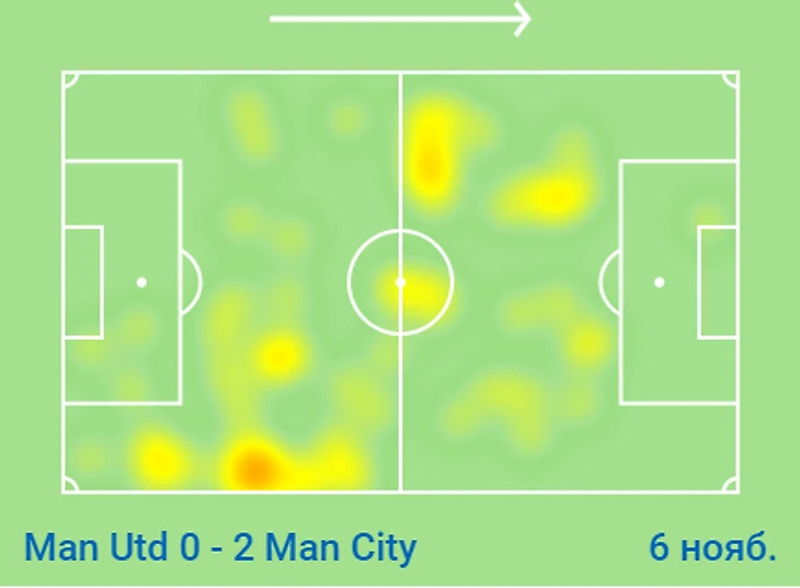 В первые 12 минут "Юнайтед" владел мячом всего 28% времени, а гости буквально заперли соперника на его половине поля, не позволив выполнить даже 50 передач за это время. Показательно, что Фернандеш, который был вынужден отрабатывать в обороне у своей штрафной ввиду активности там Канселу и Фодена (у Бруно пять успешных отборов, лучший на поле), просил партнеров прессинговать оппонентов выше, но, например, выдергивания Фреда или, реже, Мактоминея создавали бреши между линиями, едва ли не ухудшая ситуацию. Было видно, что "МЮ" не готов давить высоко по полю, но и позиционно неидеально защищался, позволяя сопернику проникать в финальную треть без помех. Да, "Сити" совершил всего три касания в штрафной Де Хеа за половину первого тайма, но постоянно нагнетал ситуацию около нее. Впервые игроки "Юнайтед" по-настоящему обосновались на чужой половине поля на 25-й минуте. В целом за матч у хозяев было всего четыре позиционные атаки с 10+ передачами на чужой половине против 16 у гостей. Есть ли более яркая иллюстрация происходящего? С большей регулярностью острые моменты стали возникать во второй половине первого тайма, когда команда Сульшера чуть добавила в агрессии без мяча. Сначала шанс был у Роналду, которому дали пробить с 14 метров, а затем "Сити" ответил контратакой с ударом Жезуса из убойной позиции, спас Де Хеа. Впрочем, "МЮ" явно не хотел, чтобы игра приобретала столь открытый характер при 0:1, стараясь сохранять структуру. С одной стороны, расположение Фернандеша правее в тройке полузащиты было понятным: через этот край гости чаще всего атакуют, есть возможность максимально быстро через португальца выйти в ответную атаку. С другой стороны, у Бруно было крайне мало пространства для этого, так как "Сити" насыщал указанную зону, в том числе за счет движения Гюндогана. Безусловно, португальцу не привыкать отрабатывать без мяча, это один из самых дисциплинированных футболистов при Сульшере, способный выполнять любой скрипт на поле, но подобная нагрузка откровенно негативно влияла на его креативность. Впрочем, Бруно хорошо знает Канселу, и это тоже могло стать фактором, повлиявшим на выбор позиции для плеймейкера "МЮ". Однако именно он не помешал фулбеку навесить в первой голевой ситуации. Да и в целом у Канселу было много свободы. Пожалуй, чересчур много для игрока, через которого команда Пепа организует большую часть атак, и который чаще остальных футболистов "Сити" в этом сезоне АПЛ угрожает воротам соперника.