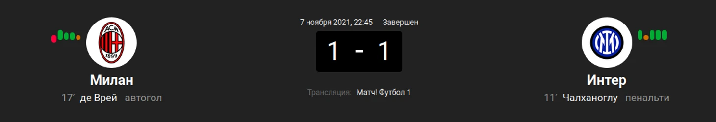 Миланское дерби завершилось вничью впервые с апреля 2018-го года.