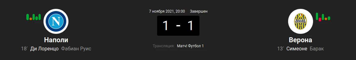 «Наполи» сыграл вничью с «Вероной», для команды Лучано Спалетти это первая потеря очков в домашнем матче чемпионата. Концовку матча гости доигрывали вдевятером: четыре желтые карточки на двоих получили Даниэль Бесса и Никола Калинич.