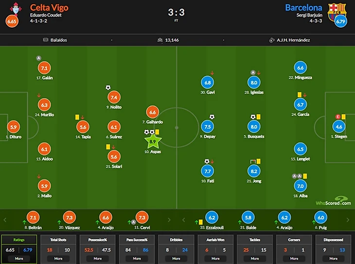 Голы: Фати (Альба, 5') 0:1; Бускетс (Нико Гонсалес, 18') 0:2, Депай (Альба, 34') 0:3, Аспас (52') 1:3, Нолито (Серви, 74') 2:3, Аспас (Галан, 90 + 6') 3:3