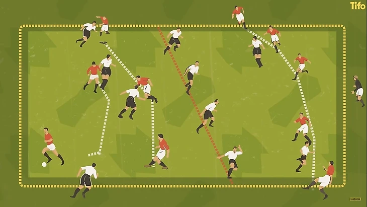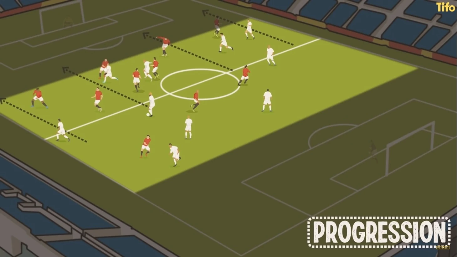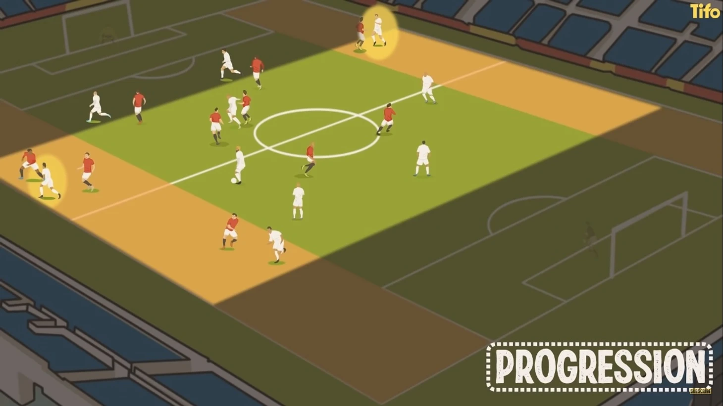 Для преодоления таких ситуаций существуют ключевые способы, которым команда может следовать, чтобы увеличить свои шансы на успешное продвижение мяча. Это сохранение ширины с игроком на каждом фланге, чтобы растянуть соперника в стороны, и появления пространства между линиями защиты, а также для того, чтобы растянуть блок по вертикали.
