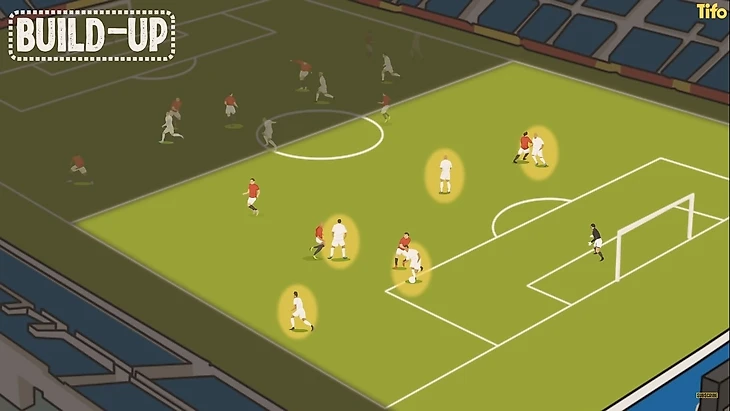 Начиная с защиты, после удара от ворот или ввода вратарём мяча руками - команда, которая владеет мячом начинает фазу наращивания. Игроки пытаются сломать первую линию давления соперника с помощью различных принципов, таких как постоянное поддержание одного дополнительного игрока по отношению к прессингующей линии противоположной команды. Игра в высоком темпе и с небольшим количество касаний мяча, всегда с вертикальной и фланговой поддержкой игрока с мячом, что увеличивает доступные возможности для передачи.