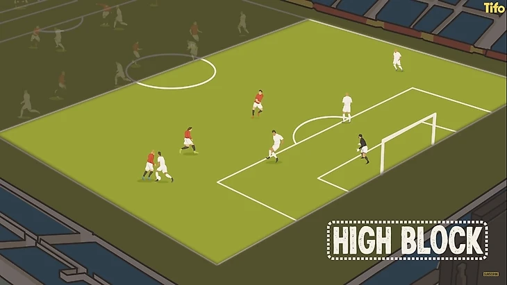 Каждый из этапов игры сопровождает игра без мяча, которая является зеркальным отображением по отношению к команде, владеющей мячом. Здесь также важно положение игроков на поле и здесь известны так называемые "блоки": высокий, средний и низкий блоки. Когда команда с мячом находится на первом этапе игры, а команда без мяча оказывает на неё давление, находясь в высоких позициях - считается, что подобная команда защищается с помощью высокого блока.