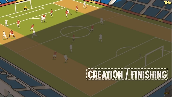 Смены позиций игроками также могут создавать пространство и хаос в защитной форме соперника, а создание треугольных структур на широких участках также является ключом для продвижения мяча. После того, как команда успешно построила игру на первых двух третях поля, далее она ставит задачу установить владение мячом в последней трети поля. В финальной трети поля многие команды будут стремиться перегрузить линию обороны противника, атакуя большим количеством атакующих игроков и поддерживая баланс в пространстве позади них. С пятью игроками в последней-атакующей линии команда может занимать пространство по всей ширине поля. Чтобы сделать это, команды также попытаются быстро переключить курс атаки на противоположную сторону, пытаясь создать ситуации численного превосходства игроков, или создавая изоляции, используя сильные стороны своих игроков, заведомо зная слабые точки в обороне соперника.