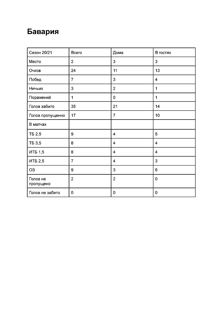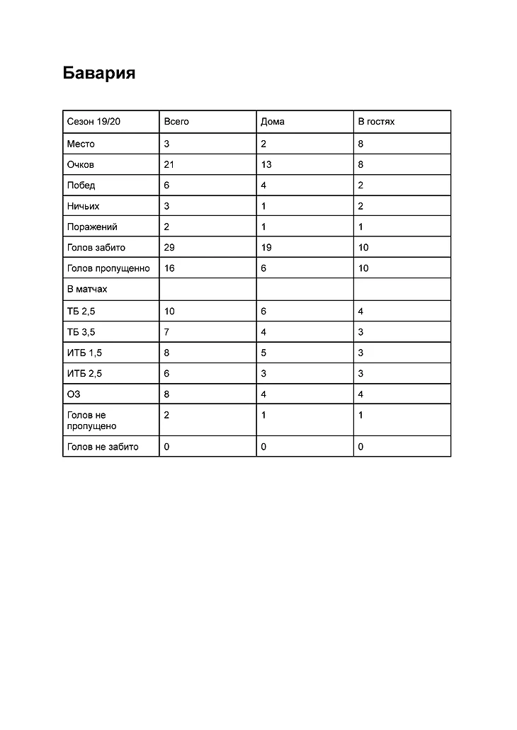 Во всех домашних матчах играл ТБ 2,5 Во всех домашних матчах играл ИТБ 1,5 Во всех выездных матчах играл ОЗ да В половине домашних матчей Бавария не пропустила В 8 случаях из 11 играл ТБ 3,5 В 8 случаях из 11 играл ИТБ 3,5