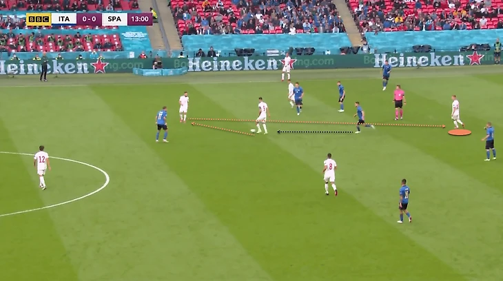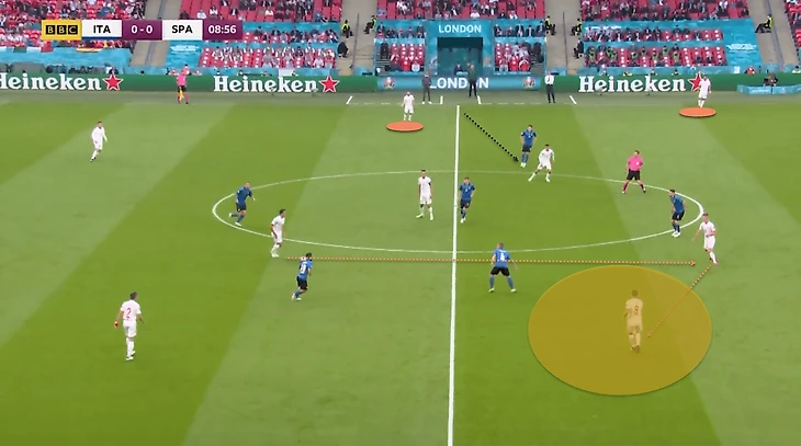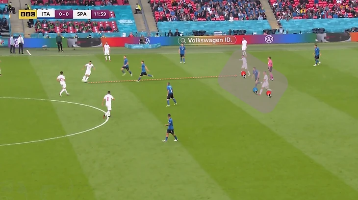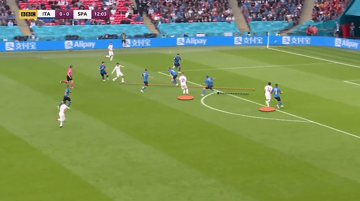 Здесь Ольмо опускается в полузащиту, и его присутствие означает, что Коке остается свободным, что позволяет ему легко завладеть мячом, когда Ольмо отдаёт адресует ему передачу после паса от Эрика Гарсии. Также обратите внимание на то, как Федерико Кьеза выдернулся в середину с правого фланга, чтобы опекать Педри, ведь иначе Испания получила бы численный перевес в полузащите. Но этот манёвр итальянца освободил пространство слева для Жорди Альбы и Феррана Торреса, еще одна ситуация, которая будет повторяться на протяжении всего матча.
