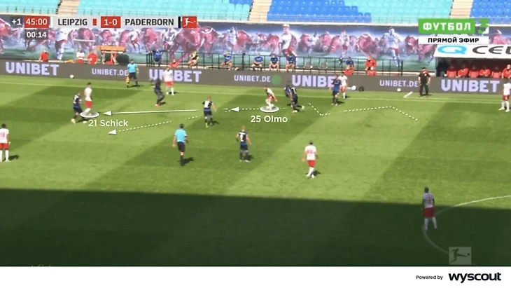 Когда Ольмо получает мяч, Бонуччи вынужден выдернуться из своей зоны, но это не мешает 23-летнему игроку развернуться и проскочить мимо него в свободное пространство.