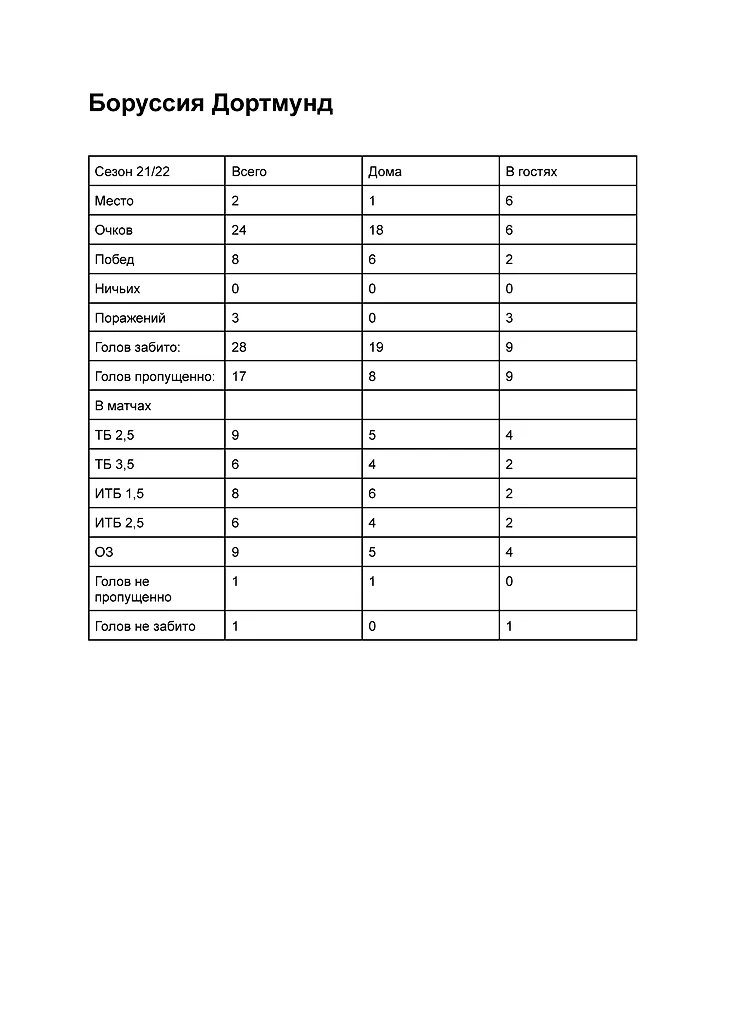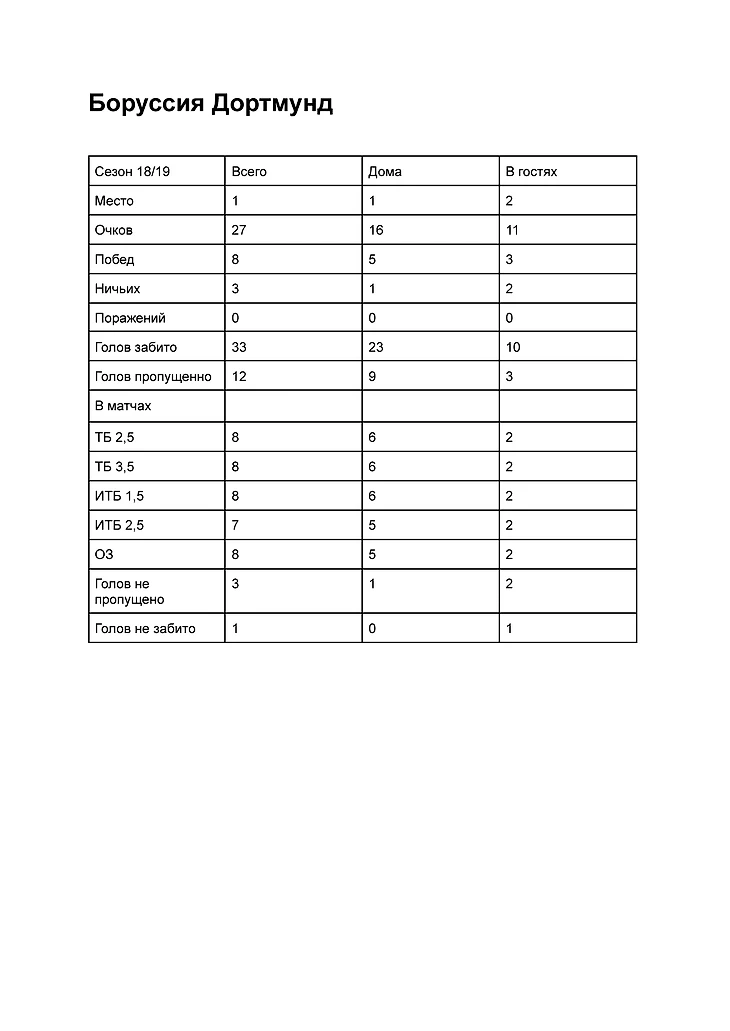 Не было ни одной ничьи в матчах Боруссии Дортмунд на выезде гораздо слабее, чем дома В 5 домашних матчах из 6 играл ТБ 2,5 Во всех домашних матчах играл ИТБ 1,5 В 9 матчах из 11 играл ОЗ да В 4 домашних матчах из 6 играл ИТБ 2,5