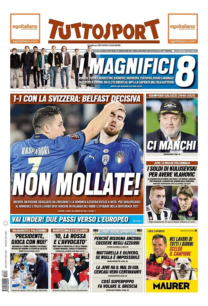 Ничья со Швейцарией, Жоржиньо смазал «квалификационный» пенальти: всё решится в понедельник. Борьба за Мундиаль: на «Олимпик» Италия сразу пропустила (гол от Видмера), затем Ди Лоренцо сделал 1:1. На 90 минуте разочарование из-за незабитого пенальти полузащитника, как в первом матче. Адзурри впереди из-за разницы голов (+2): в Северной Ирландии должны побеждать и надеяться, что швейцарцы не разгромят Болгарию.