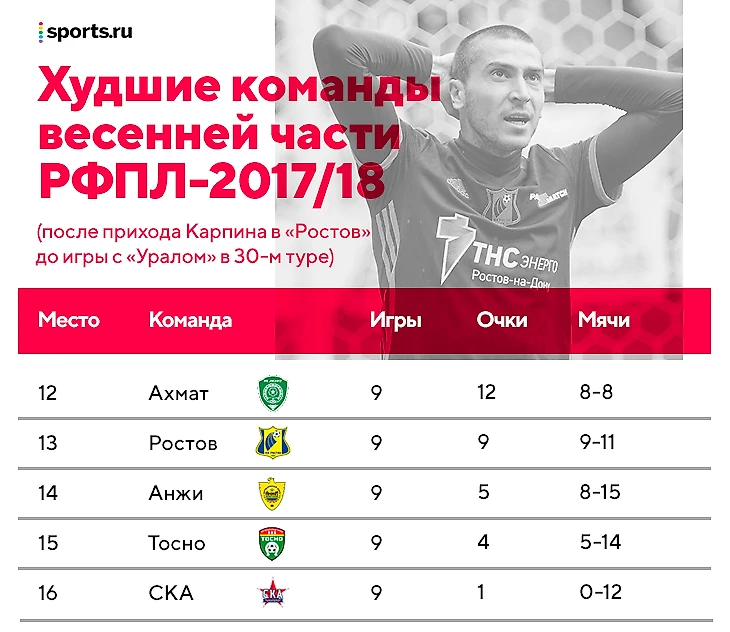 После СКА «Ростов» сыграл вничью с «Рубином», обыграл «Тосно» и проиграл «Спартаку». За девять весенних матчей лишь три команды лиги набрали меньше очков, чем «Ростов» Карпина.