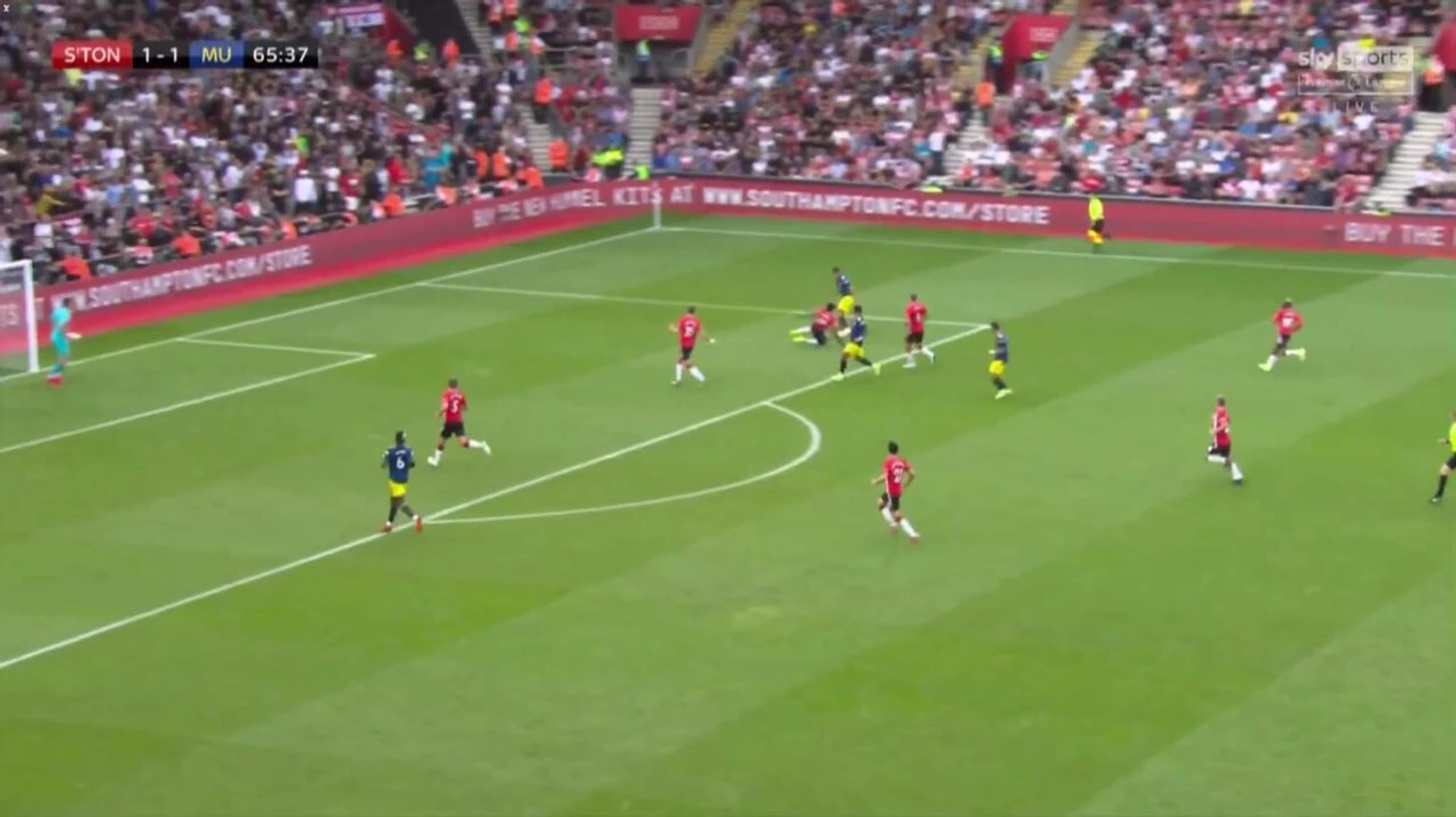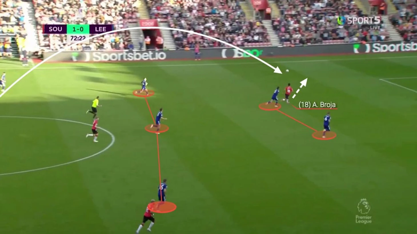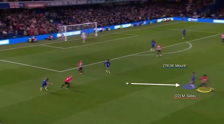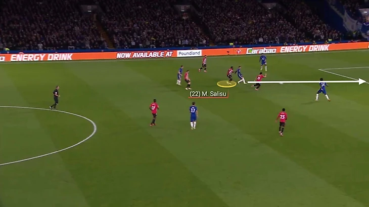 В одной ситуации голкипер лондонцев, Кепа Аррисабалага, отдает пас низом на одного из своих сокомандников. Еще до того, как передача доходит до адресата, Салису включается в активный прессинг. Результатом становится пас назад на Матео Ковачича – но это не останавливает защитника «Саутгемптона».