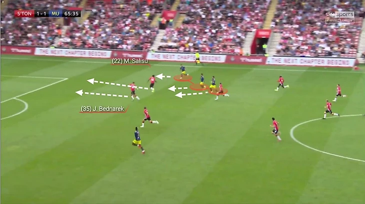 Начнем с августовского матча с «МЮ», закончившегося со счетом 1-1. Пока три игрока «дьяволов» атакуют, Салису отказывается выбрасываться. И он, и Беднарек отступают, но наш герой не спускает глаз с мяча, пытаясь предугадать, какой игрок в черной форме получит его дальше.