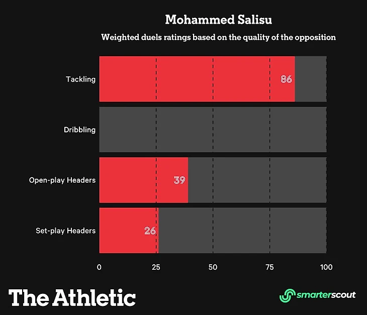 Smarterscout оценивает и способности к игре один-на-один, включающие в себя отбор мяча, игру головой и обводки. Количество баллов зависит от качества соперников, с которыми Салису сталкивался лицом к лицу. Например, за остановку такого мастера дриблинга, как Мохаммеда Салаха, он получил бы намного больше, нежели за Харри Магуайра.