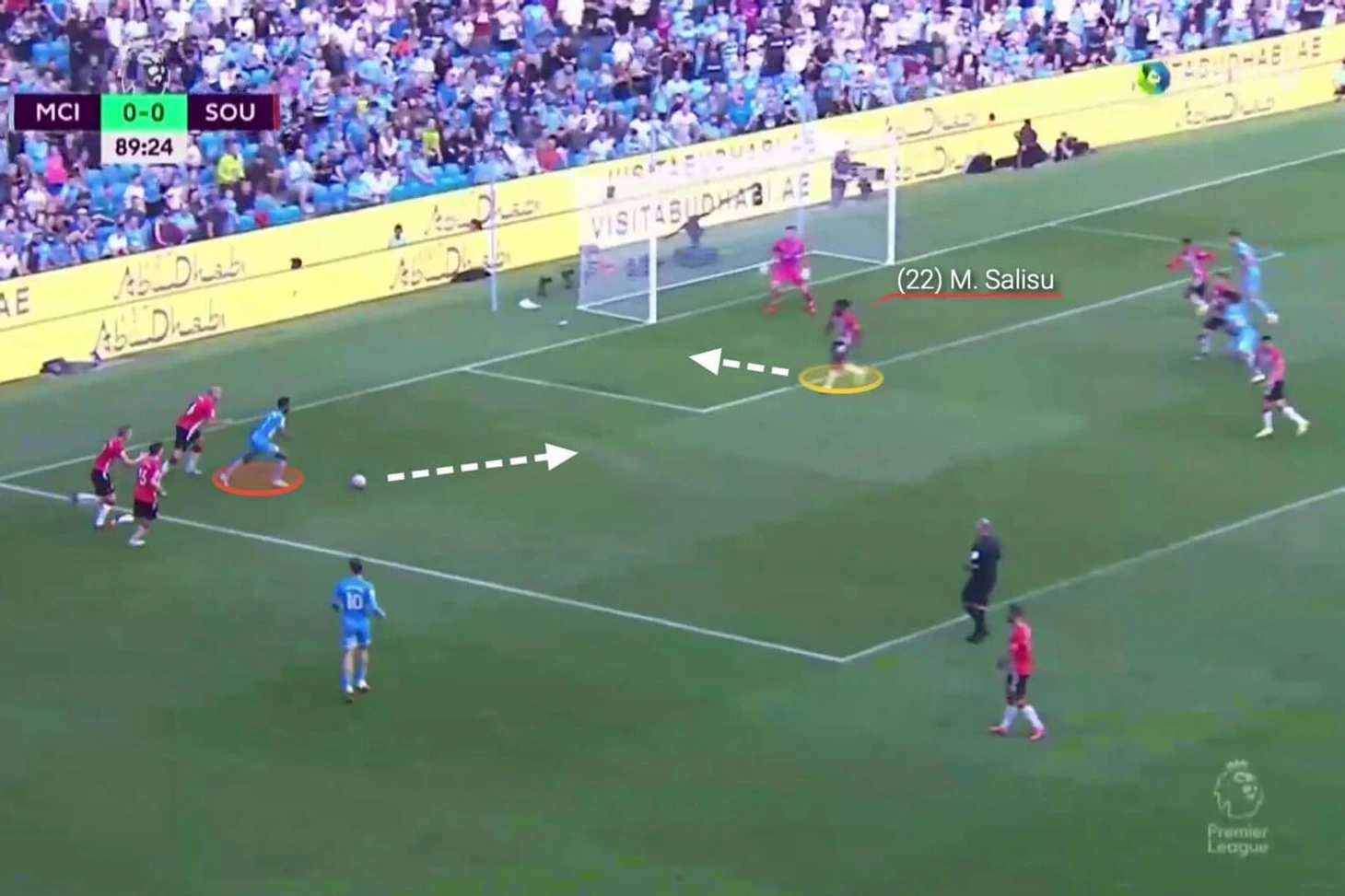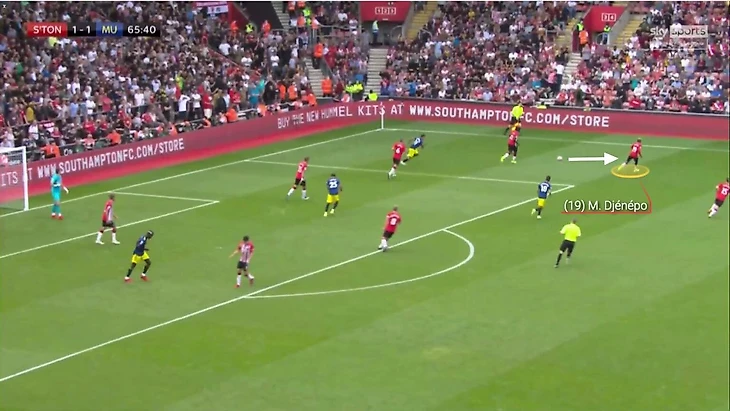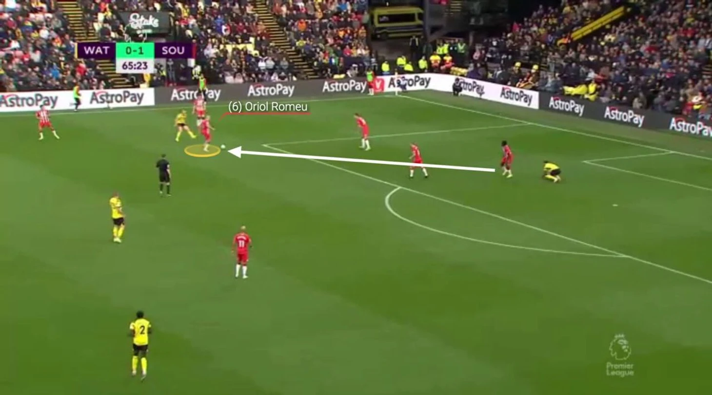 Салису понимает как развивается ситуация и располагается таким образом, чтобы Кинг не смог устоять на ногах при приеме паса. Как итог, заключительная фаза атаки «Уотфорда» закончилась тем, что Джошуа оказался на газоне, а мяч вернулся к «Саутгемптону».