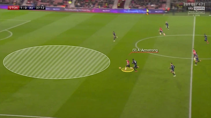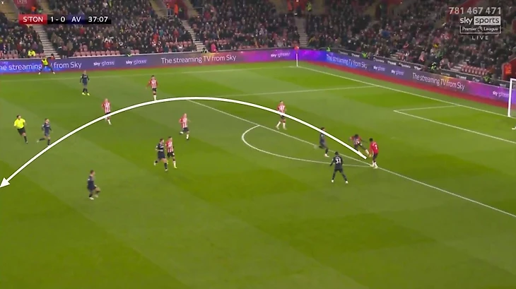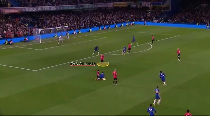 Отличный прием Армстронга позволяет прокинуть мяч мимо защитника «Виллы» и устремиться в практически беспрепятственном рывке в сторону ворот лондонцев.