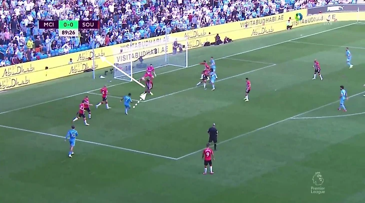 Стерлинг искусным дриблингом оставляет не у дел трех игроков «святых», смещаясь в свободную зону штрафной.