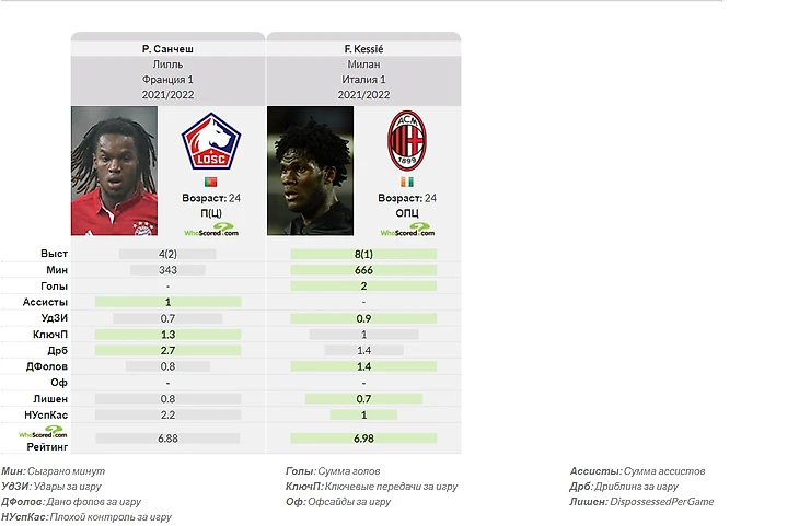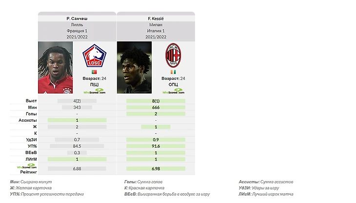 Но что касается атаки, то тут цифры у Ренату получше чем цифры Франка. Санчес делает 1.3 ключевых паса за 90 минут, идет в дриблинг 2.7 раза за игру в среднем. У Кессье эти показатели равны 1 и 1.4 соответственно. Также стоит отметить, что количество передач вразрез у игрока Лилля тоже выше. Португалец отдает почти 5! длинных пасов за игру.