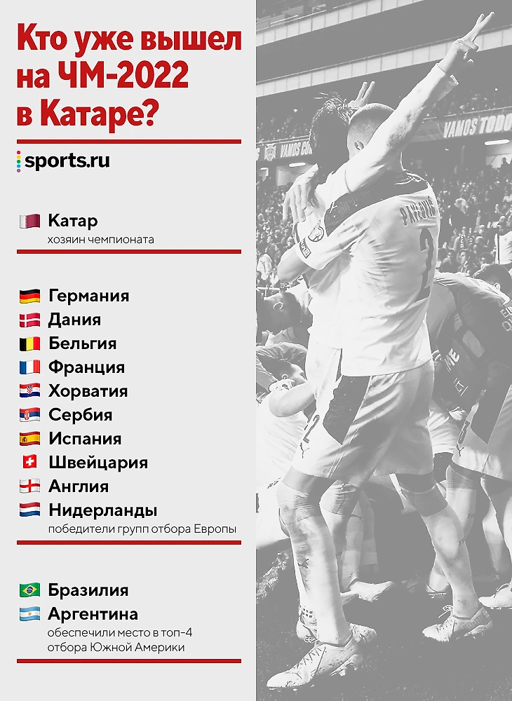 Основная часть европейского отбора на ЧМ-2022 закончена. Россия пока едет в стыки, а 10 команд уже забронировали билеты в Катар. К ним уже точно присоединятся главные южноамериканские гранды – Бразилия и Аргентина.
