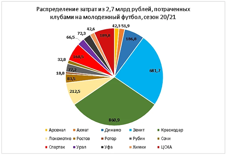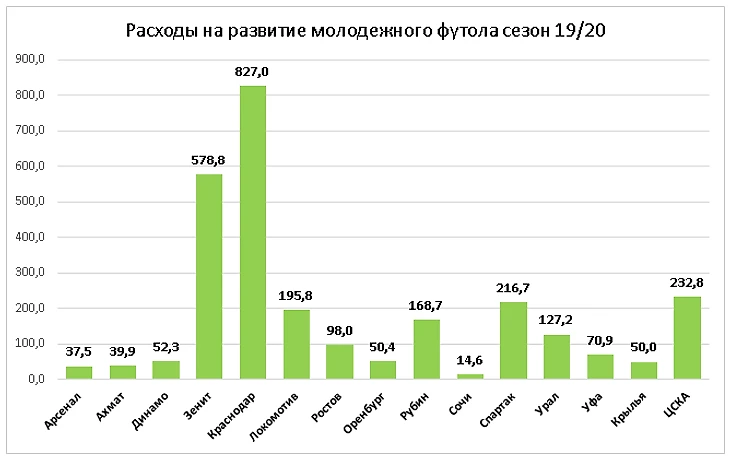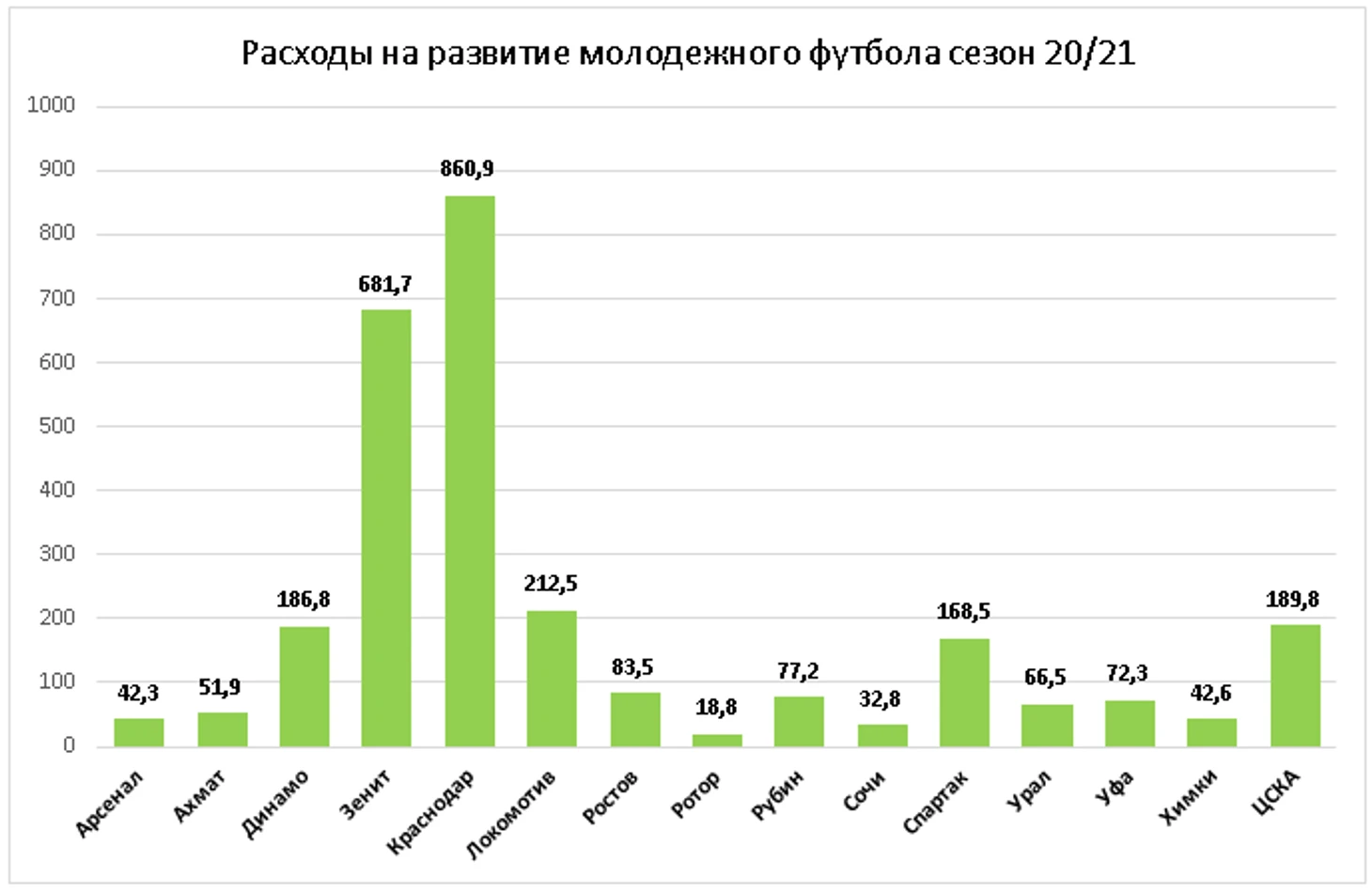 В сезоне 19/20 клубы в совокупности потратили 2,7 миллиарда рублей на развитие молодежного футбола. Данная статья расходов включает в себя обновление инфраструктуры молодежных академий, а также зарплату персонала, участвующего в подготовке спортсменов. Лидером с огромным отрывом по количеству выделенных средств является «Краснодар». «Быки» потратили 827 миллионов рублей на развитие молодежного футбола. Учитывая подход клуба к развитию футбола в Краснодарском крае, количество возведенных полей и манежей, данный расклад не должен вызывать удивления. На втором месте находится «Зенит», который согласно представленным данным потратил на развитие молодежного футбола 578,8 миллионов рублей. На третьем месте находится ЦСКА, потративший 232,8 миллионов рублей. На четвёртом месте Спартак с 216,7 миллионами. Конечно, это немного не соотносится с цифрами, заявленными Федуном, но на этом останавливаться не будем. Меньше всех в РПЛ на развитие молодежного футбола потратил «Сочи» – 14 миллионов рублей.
