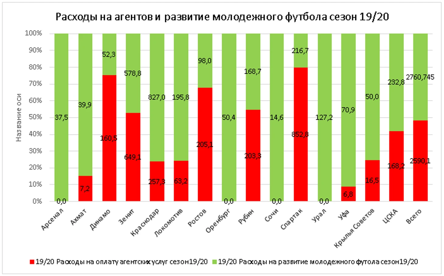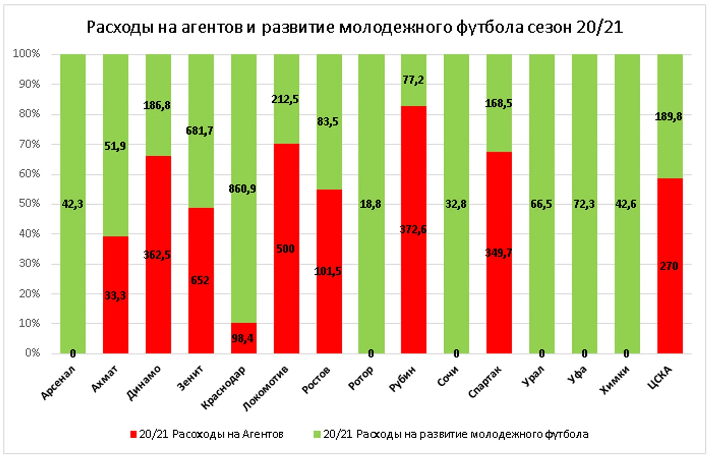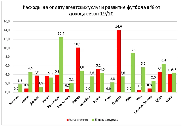 Пять клубов в сезоне 19/20 потратили на оплату услуг агентов больше денежных средств, чем на развитие молодежного футбола. «Спартак» в данном случае демонстрирует наибольший разрыв. На агентов клубом было потрачено 852 миллиона рублей, когда на развитие молодежного футбола ушло всего лишь 216 миллионов. В три раза превышает количество средств, выплаченных посредникам суммы потраченные на молодежный футбол у «Динамо» – 160 миллионов рублей против 52. «Урал» значительно выделяется на фоне остальных клубов, выделив 127 миллионов рублей на академию, он не потратил ни рубля на выплату агентам. «Краснодар» лидирует по количеству средств потраченных на развитие молодежного футбола по сравнению с расходами на оплату услуг посредников.