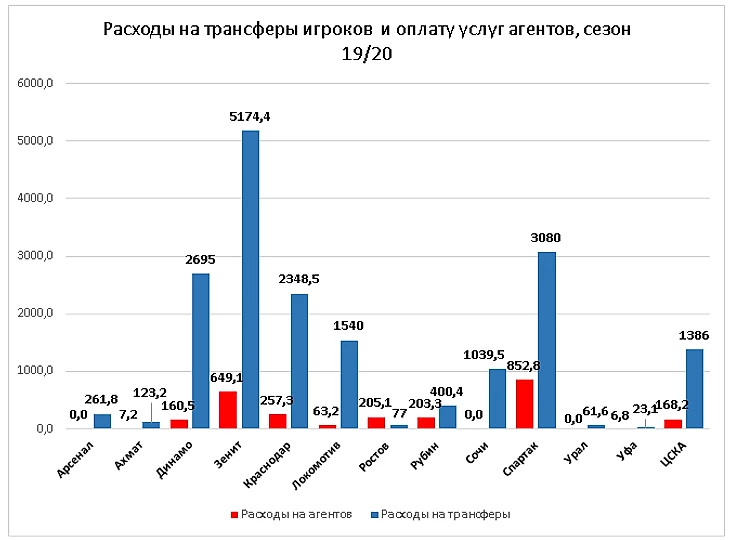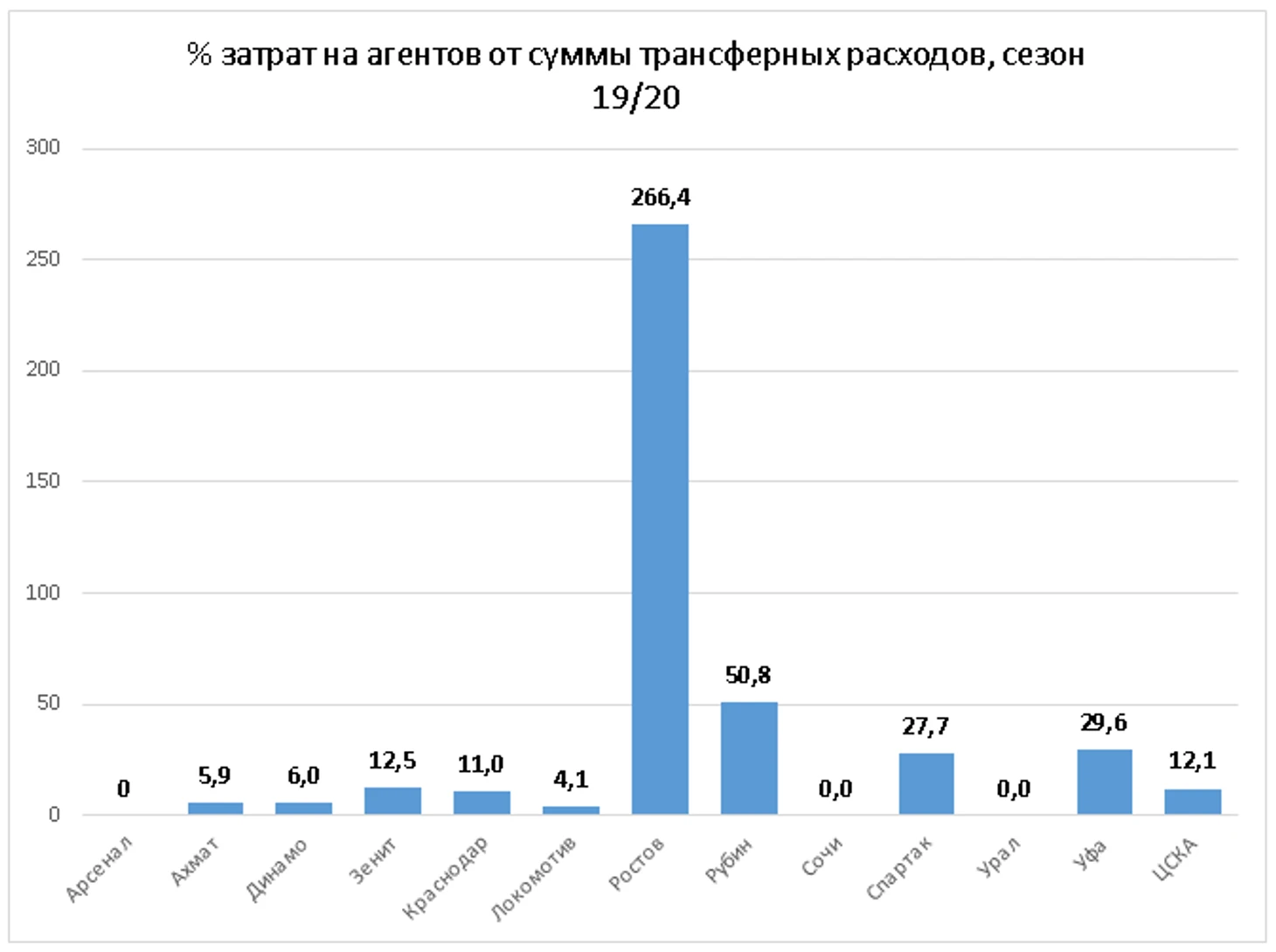 Лидерам по тратам на игроков в сезон 19/20 были «Зенит» и «Спартак», клубы потратили на трансферы 5,2 и 3,1 миллиарда рублей соответственно. На третьем месте расположилось «Динамо», потратившее 2,7 миллиарда. При этом явно видно, что какого-то соотношения, позволяющего определить средние расходы на агентов в зависимости от активности на трансферном рынке нет. «Динамо» потратило на игроков на 347 миллионов рублей больше чем «Краснодар», но при этом выплатило агентам на 97 миллионов рублей меньше. Не слишком активный на трансферном рынке «Ростов», который потратил на укрепление состава всего 77 миллионов рублей, каким-то образом умудрился заплатить 205 миллионов рублей посредникам. Определить какое-либо здоровое соотношение здесь, кажется, невозможно.