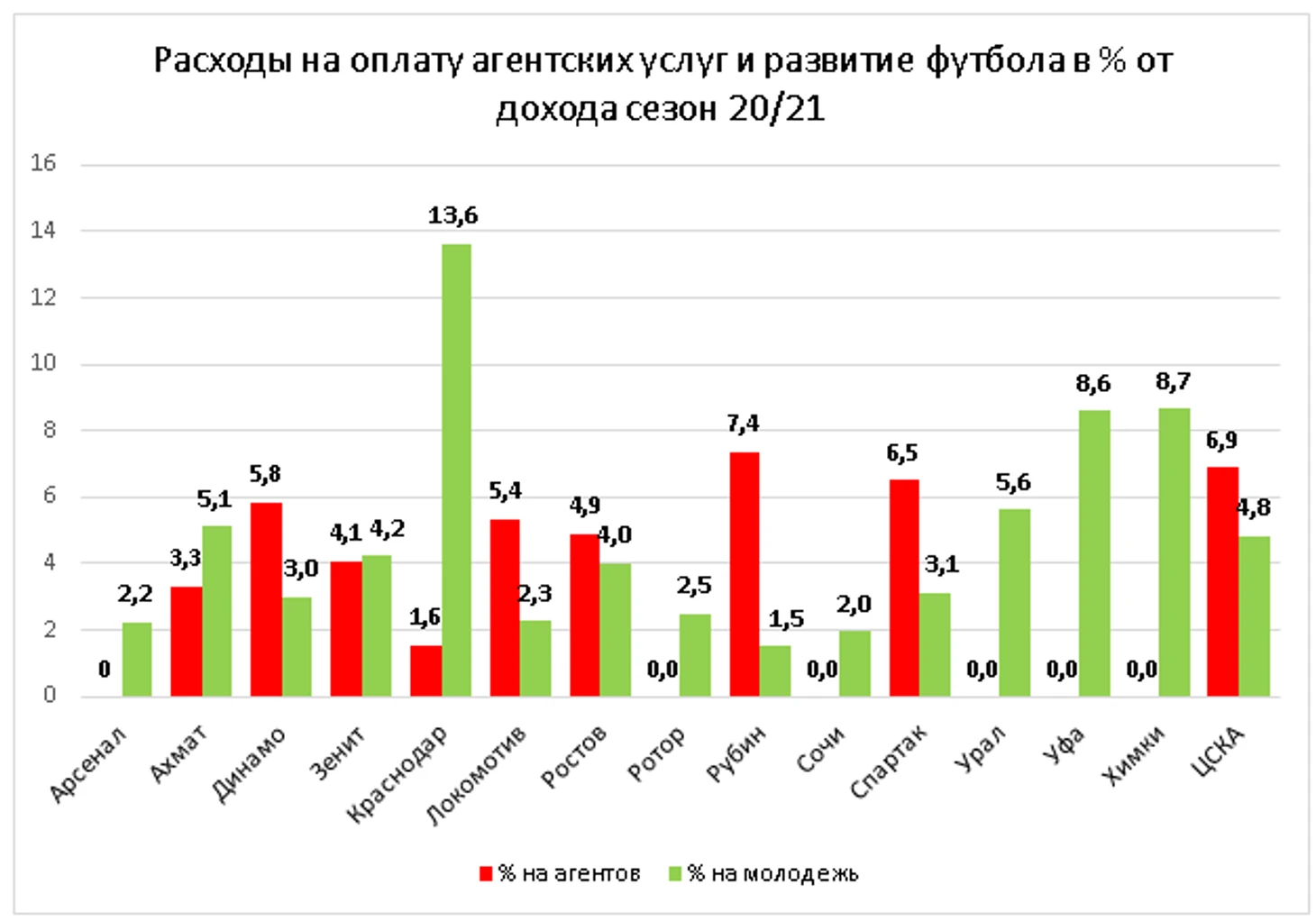 В сезоне 20/21 «Краснодар» также сохранил лидерство, при этом увеличив разрыв в соотношении между расходами на агентов и молодежь. «Рубин» как и «Динамо» выплатили агентам значительно больше чем за предыдущий сезон, правда в отличии от клуба из Казани, москвичи увеличили финансирование молодежного футбола, сделав разрыв не таким удручающим. «Спартак» также как и в сезоне 19/20 потратил больше денег на оплату услуг посредников, чем на развитие академии. «Зенит» тратит примерно одинаковые суммы как на развитие молодежи так и на выплаты агентам.