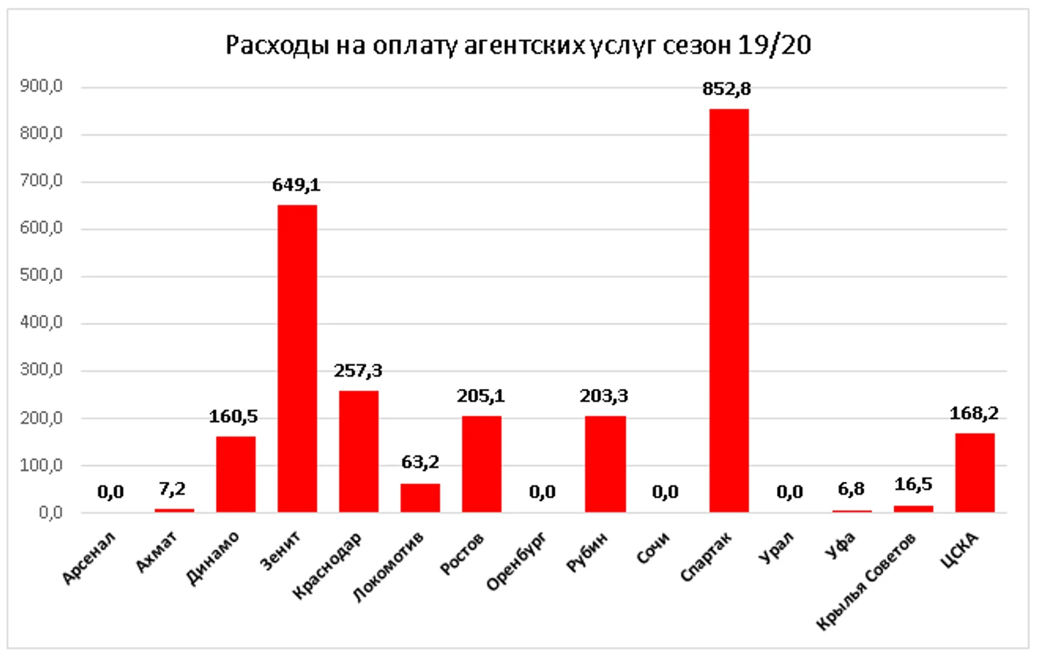 В сезоне 19/20 клубы в совокупности выплатили посредникам 2,5 миллиарда рублей. Явным лидером по поддержке финансового благополучия агентов в сезоне 19/20 был «Спартак». Клуб выплатил агентам 852 млн. рублей. Следом за ним идет Зенит, который потратил весьма внушительные 649 миллионов. «Краснодар», «Ростов» и «Рубин» перешагнули отметку в 200 миллионов рублей. Четыре клуба в строке расходов на оплату агентских услуг указали 0 рублей. Вполне возможно,что клубы действительно не прибегали к помощи агентов, но скорее всего просто размыли данные расходы среди прочих затрат.