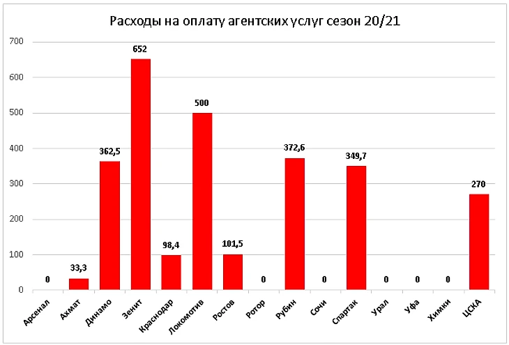 В прошлом сезоне, общая сумма расходов на оплату услуг агентов чуть-чуть подросла и составила уже 2,7 миллиарда рублей. Лидером в прошлом сезоне по данному показателю стал «Зенит». При этом его расходы незначительно отличаются от сезона 19/20. В сезоне 20/21 клуб потратил 652 миллиона рублей, что всего на 3 миллиона больше, чем за предыдущий период. На втором месте находится Локомотив, который выплатил агентам солидные полмиллиарда рублей. Краснодар по сравнению с сезоном 19/20 значительно сэкономил, сократив затраты на оплату услуг посредников на 158 миллионов до 98,4 миллионов. «Рубин», «Динамо» и «Спартак» преодолели отметку в 349 миллионов рублей выплат. «ЦСКА» замыкает этот «топ-лист» с 270 миллионами потраченных средств. Шесть клубов РПЛ отчитались о нулевых выплатах в адрес агентов.