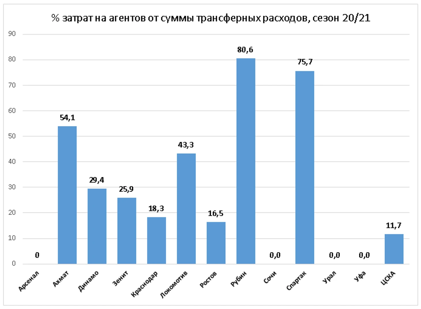 Если мы взглянем на процентное соотношение между расходами на агентов и трансферы игроков в сезоне 20/21, мы увидим ту же не сбалансированную картину. «Рубин» выплатил агентам сумму равную 80% от трансферного бюджета, «Спартак» потратил близкие к ним 75%. Наименьшее соотношение у ЦСКА, который напомним, был на втором месте по количеству затрат на трансфер игроков в сезоне 20/21.