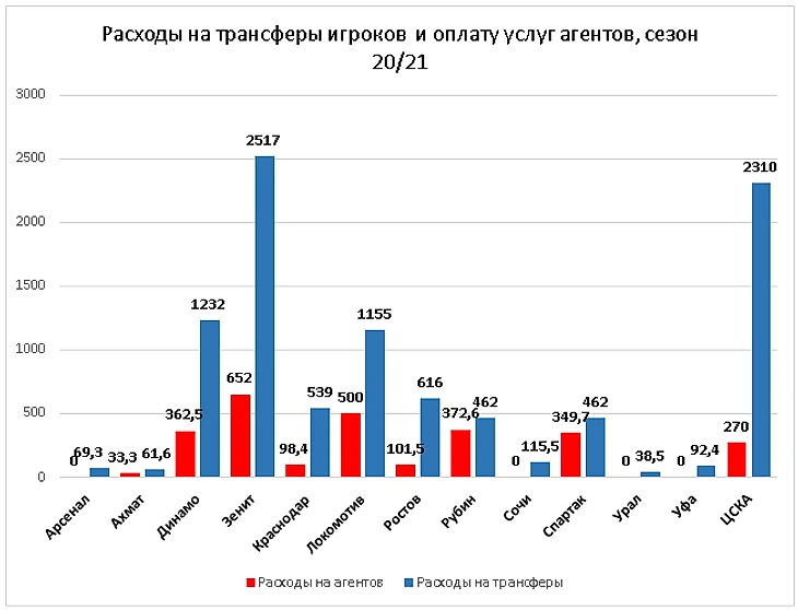 В сезоне 20/21 лидером по тратам на трансферном рынке остался «Зенит». На второе место неожиданно вышел ЦСКА, потративший на игроков 2,3 миллиарда рублей. Третье место заняло «Динамо» с 1,2 миллиардами, потраченными на укрепление состава, а на четвертом месте находится «Локомотив» выделивший 1,1 миллиард на приобретение игроков. При этом и здесь не наблюдается какой-то четкой взаимосвязи. «Спартак», потративший всего 462 миллиона рублей, перечислил агентам 350 миллионов рублей. «Рубин», потративший те же 462 миллиона, в свою очередь выплатил агентам еще больше – 373 миллиона рублей. «Ахмат» приобрел игроков на 61 миллион, а выплатил посредникам практически 34 миллиона рублей.