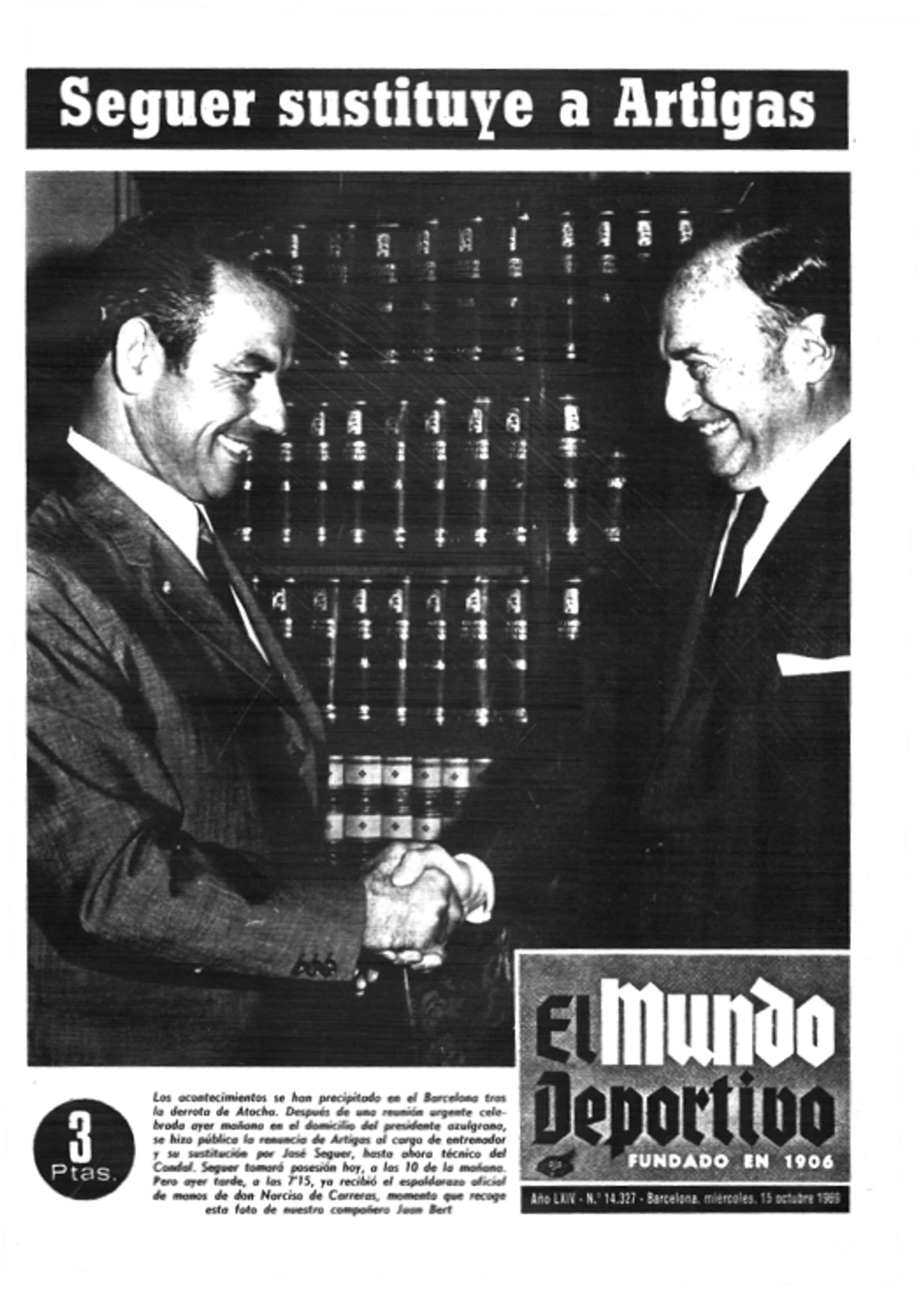 Нарцис Каррерас: «Мы собрались здесь, как вы все знаете, чтобы передать Сегеру должность тренера первой команды "Барселоны". Тем не менее, я хотел бы, чтобы мои первые слова были данью уважения ушедшему в отставку Дону Сальвадору Артигасу, человеку, который всегда выполнял свой долг не только из-за контракта, заключённого с клубом, но и по причине любви к цветам "Барселоны". Артигас ушёл, потому что так сложились обстоятельства, но он сделал это… как настоящий джентльмен, которого абсолютно нечем упрекнуть…