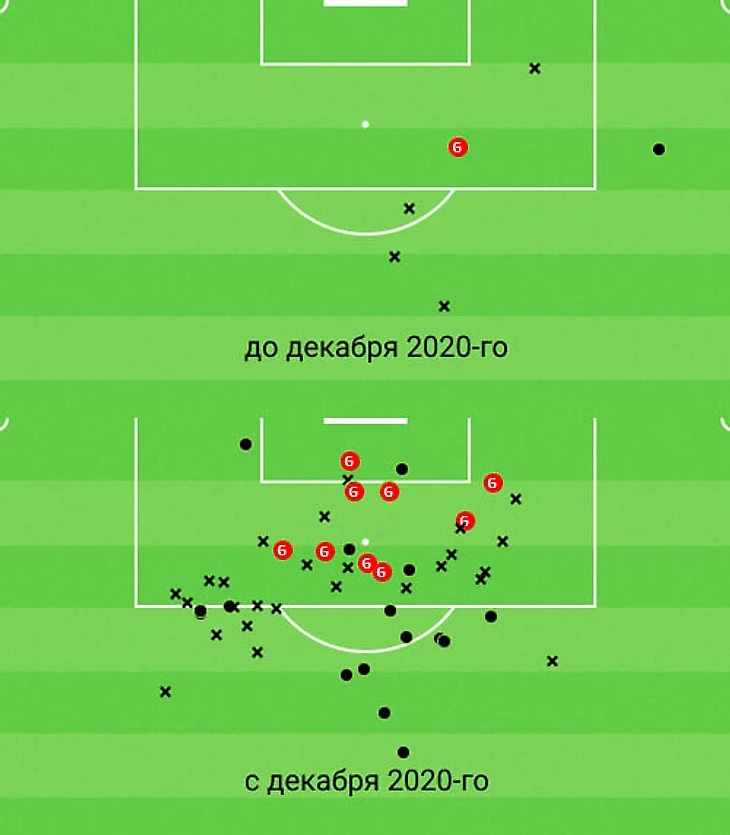 За этот сезон Юсупов уже перебил прошлогодний xG (тогда – 2,28, сейчас – 2,84). Скоро Артур догонит результат сезона-2020/21 по ударам (тогда – 33, сейчас – 24), но гораздо интереснее сравнить активность до постоянного перевода на новую позицию и после.