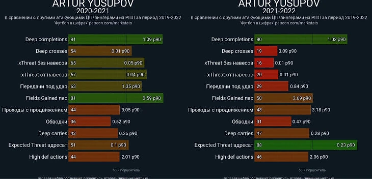 Показатели измеряются в перцентилях. Чем показатель выше, тем выше игрок в группе наблюдения (проще говоря, 88-й перцентиль означает, что показатель Юсупова лучше, чем у 88% игроков его позиции – статистика сильно выросла по сравнению с сезоном-2020/21).