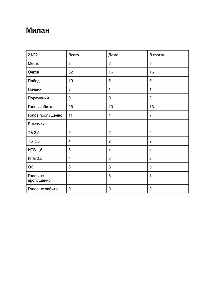 Милан так же не проигрывал на этом отрезке. (по итогам сезона потерпел 7 поражений). ТБ 3,5 играл 5 раз из 12 (по итогам сезона 11 из 38). Милан не пропустил 4 раза (14 раз по итогам сезона). Сравним с показателями сезона 19/20: