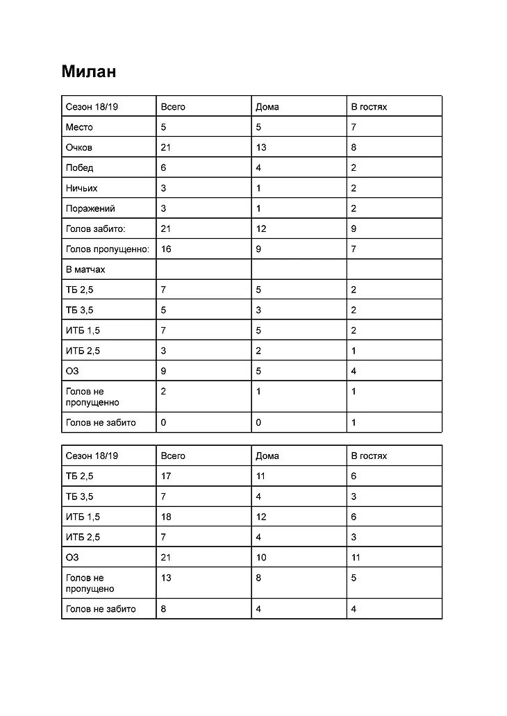 ТБ 3,5 играл 6 раз из 12 (по итогам сезона 13 из 38). Милан не пропустил 3 раза (14 раз по итогам сезона). В завершении рассмотрим сезон 18/19