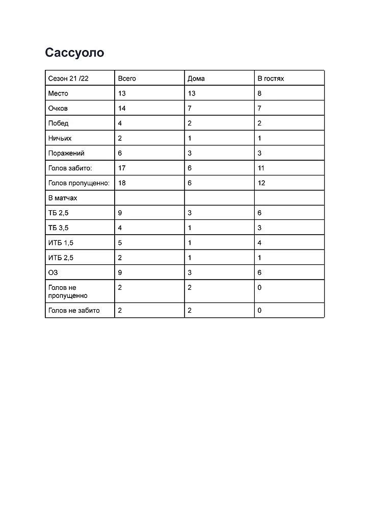 Итоги: Cассуоло продолжит играть результативно. Команда имеет ресурс для улучшения результатов и позиции в чемпионате. Прогноз: место с 8 по 12. Следите за успехами команд Италии в моем блоге