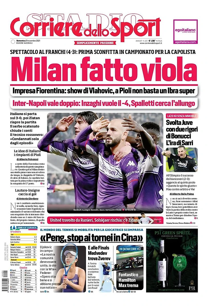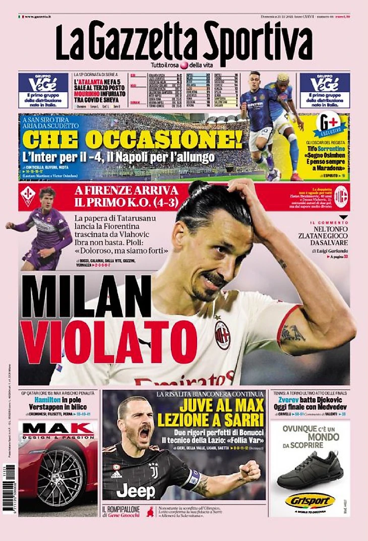 Во Флоренции случилось первое поражение (4:3). Ошибка Татарушану запустила «Фиорентину», ведомую Влаховичем: Ибры не хватило. Пиоли: «Болезненно, но мы сильны».
