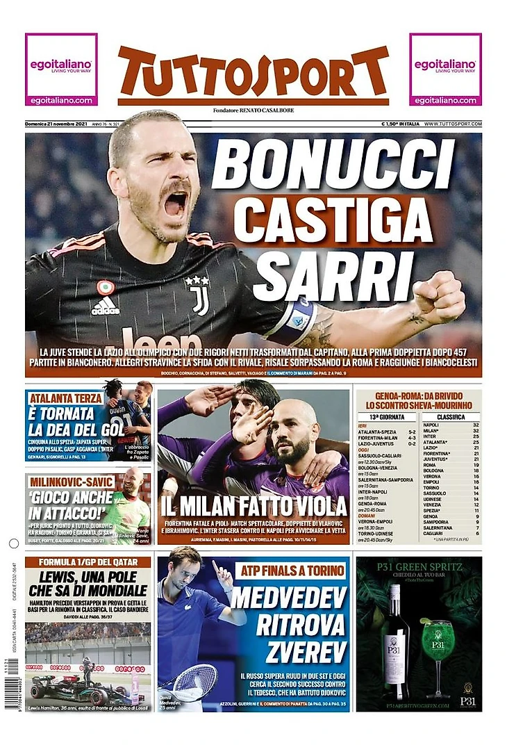 «Юве» остановил «Лацио» на «Олимпико» благодаря двум пенальти, реализованным капитаном. Первый дубль после 457 матчей в составе Бьянконери. Аллегри с успехом выиграл схватку с соперником, поднявшись, обойдя «Рому» и догнав Бьянкочелести.