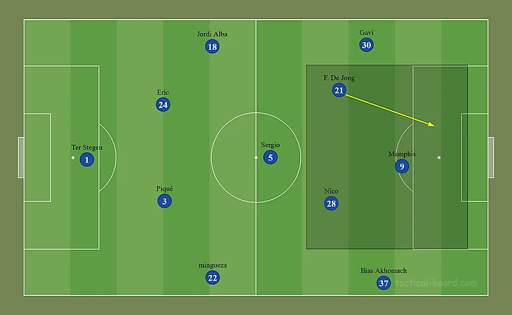 Френки располагался левее, что отличается от того, что мы видели в последнее время. На мой взгляд, такой вариант больше подходит голландцу, о чём я писал в этом тексте. Де Йонг зачастую протаскивал мяч на дриблинге, что ему достаточно хорошо удаётся, и пытался обострять. Ещё одной отличительной чертой вчерашнего выступления Френки служат регулярные подключения в зону завершения. На финальном этапе развития атаки голландец регулярно становился адресатом для последнего паса, что мы часто наблюдали при Кумане.