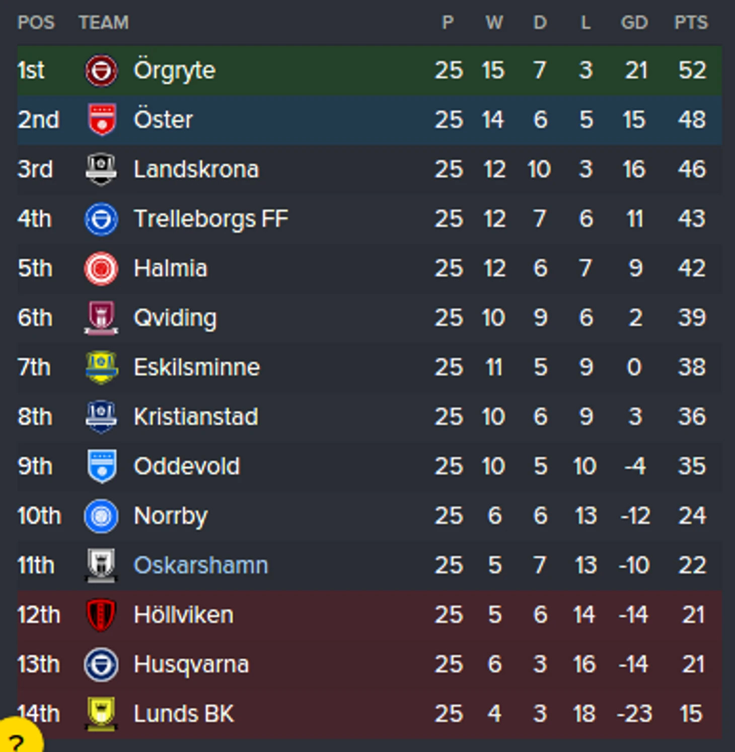 После ничьей в 1 матче с Эргрюте(лидер чемпионата), в маленьком городке с населением 18 тысяч человек, хотя бы стали говорить про футбол, а игроки поверили в себя. Затем два домашних матча, на родном искусственном отвартительном газоне, и абсолютно все шансы на сохранение команды в Лиге. Остался последний домашний матч с клубом Кристианстад, и победа гарантирует нам мучения в след сезоне в этой лиге. Как видно из таблицы, есть расклад, при котором и ничья нам поможет, но мы не будем вести себя как Сборная России и сидеть в обороне весь матч.