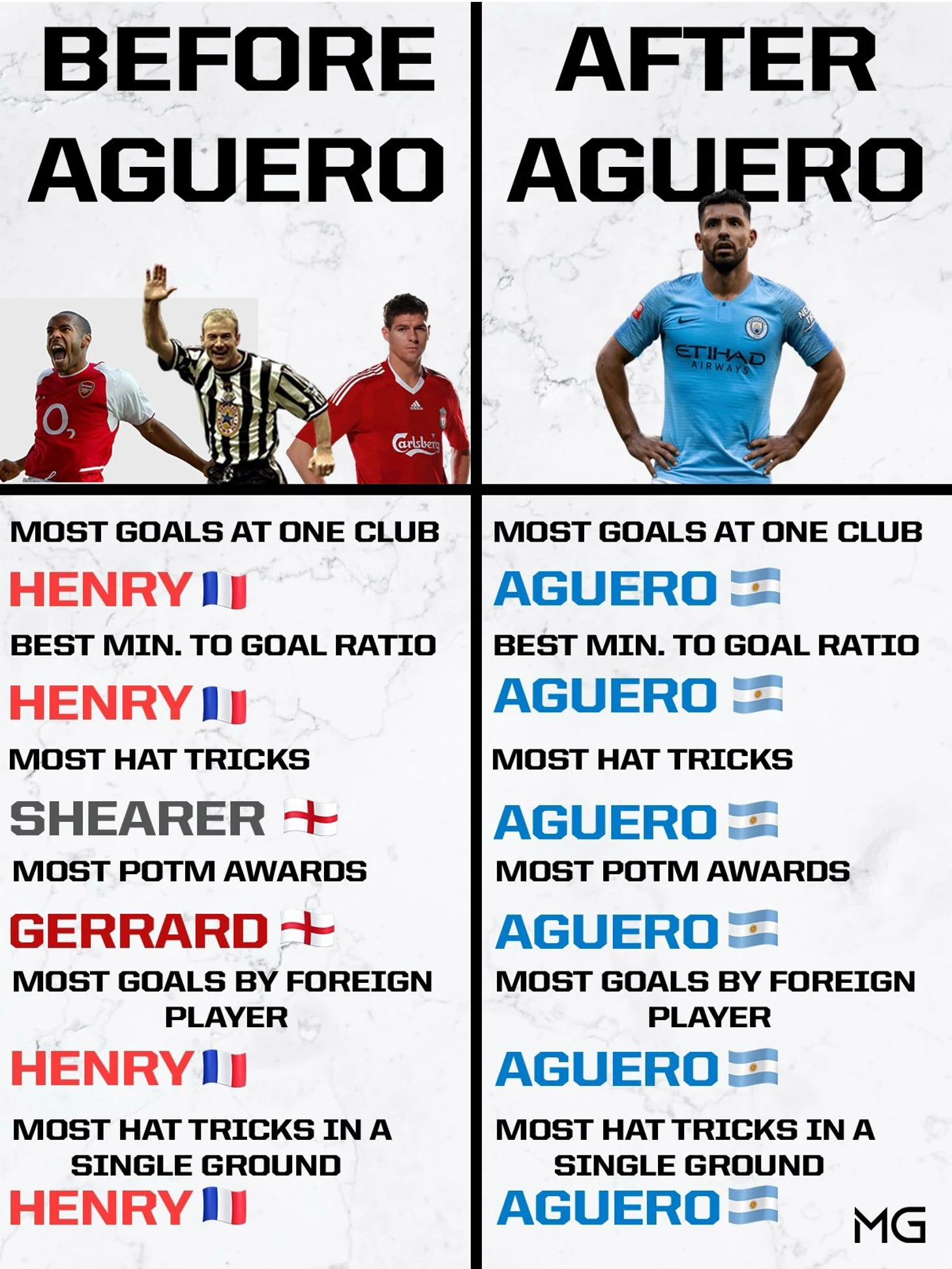По эффективности Агуэро с запасом впереди форвардов, которые забили больше 100 голов в АПЛ. В среднем он забивает каждые 106 минут, Кейн каждые 120 минут, а Анри каждые 122 минуты.