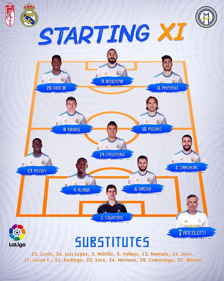 Анчелотти удивил в составе только одним выбором. 9 игроков которые вышли против Гранады - это безоговорочные игроки стартового состава. Асенсио, с учетом того, что Родриго только восстановился от травмы, а Бэйл снова травмирован, вполне ожидаемый выбор. А вот выход Начо, тем более вместо Милитао, который за последние полгода всегда выходил в стартовом составе, немного удивил.