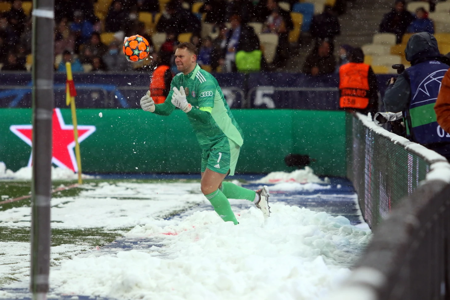 Киев в обороне не отсиживался. Непростой поле и падающий снежок немного нивелировали разницу в техническом мастерстве команд, и на первый план вышли настрой и борьба. В одном из эпизодов как раз техника и подвела Нойера, который лихо махнул ногой мимо мяча, отброшенного ему назад защитником, но «Баварии» повезло – катившийся в створ ворот мяч нашел штангу и автогола не случилось.