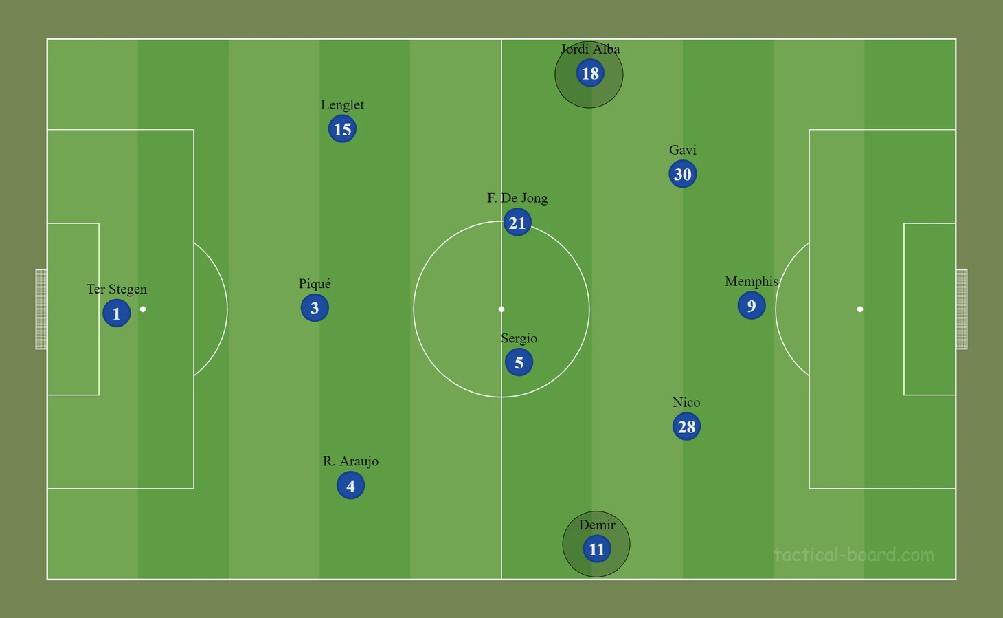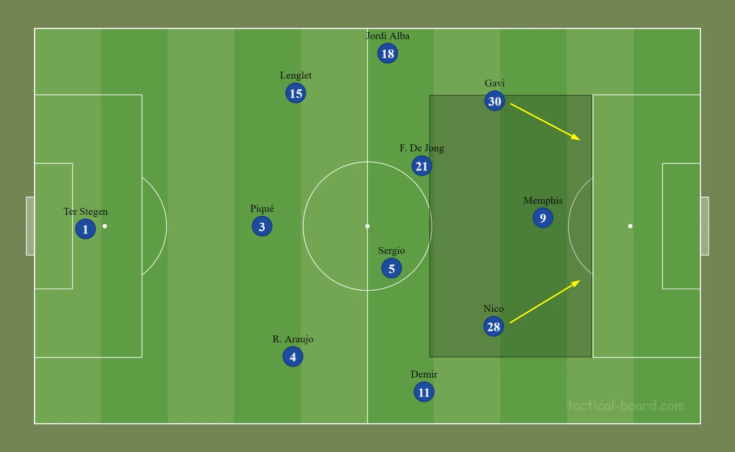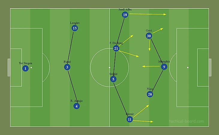 «Барса» также хорошо действовала в прессинге. Инсайды Гави и Нико поднимались, помогая Мемфису оказывать давление на соперника при началах атак. Также стоит отметить качественный контрпрессинг: после потерь игроки моментально старались вернуть себе мяч, вступая в отбор.