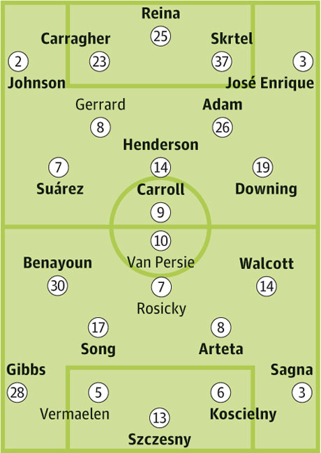 Под вопросом: Росицки, Ван Перси (оба - травма паха), Вермален (травма лодыжки)