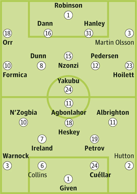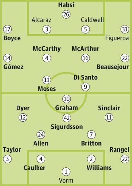 Запасные: Де Врис, Крэддок, Кайтли, Бассонг, Хант, Джонсон, Эбанкс-Блэйк, Милияш, Джонссон, Фолли, Форд