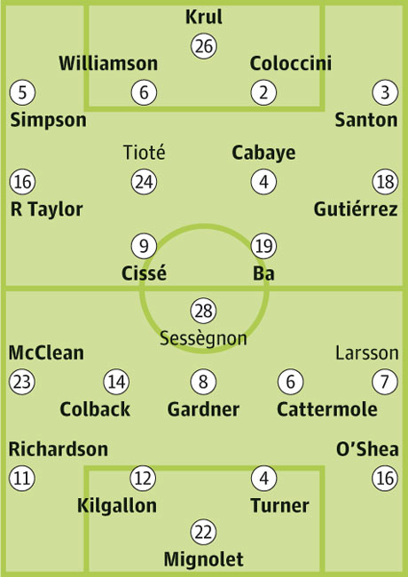 Под вопросом: Бендтнер (травма лодыжки), Сессеньон (усталость), Ларссон (болезнь), Бардсли (травма голеностопа)