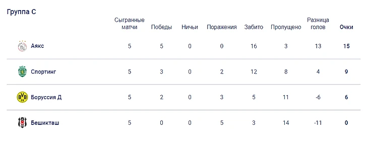 Одно слово:»ВАУ!» . Только так можно охарактеризовать группу С (Цэ). Топ-5 пранков, вышедших из под контроля. Что у нас было на бумаге:»Дортумнд» с новым и очень крутым тренером , который обязан выйти в плей-офф , «Аякс» и «Спортинг» , которые поборются за второе место , ну и «Бешикташ» , просто «Бешикташ». Что получили:»Дортумнд» , потерявший малейшие шансы на плей-офф ЛЧ и получивший ЛЕ , «Аякс», который прошёлся «ливерпульским» катком по всем и вышел за несколько туров до конца в плей-офф , «Спортинг» – второй участник плей-офф с игрой на уровне «Боруссии» , ну и «Бешикташ» 0 очков, просто «Бешикташ» . Последний тур,который уже не играет никакой роли: «Боруссия» – «Бешикташ» , «Аякс» – «Спортинг» .